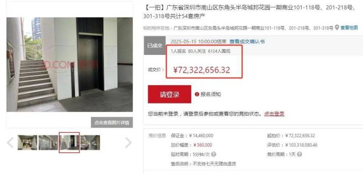 5月15日,南山54套商业打包法拍,在结束前10分钟被人“捡漏”,成交价7232.3万元。