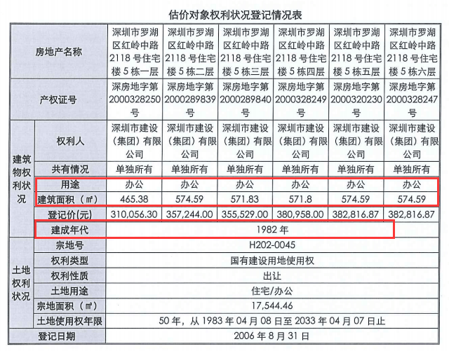 被法拍的罗湖2118号住宅楼5栋5栋1-6层,位于罗湖9号线园岭站地铁口,属于老城区核心位置。这栋楼总建面约3333㎡,每一层楼的面积大概在465-574㎡不等。产权属于深圳市建设(集团)有限公司名下,于1982年建成,土地使用年限50年。