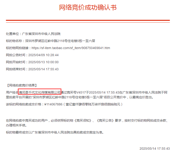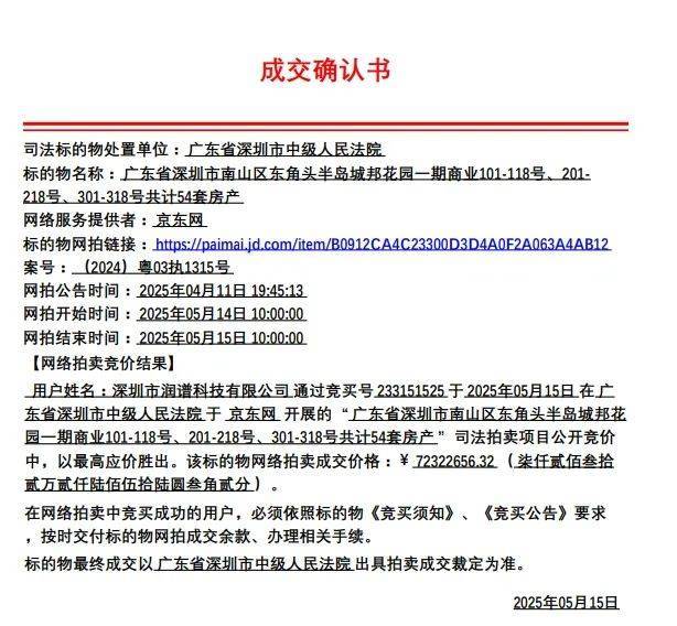 根据成交确认书显示,拿下该商业的233151525号买家,为深圳市润谱科技有限公司。