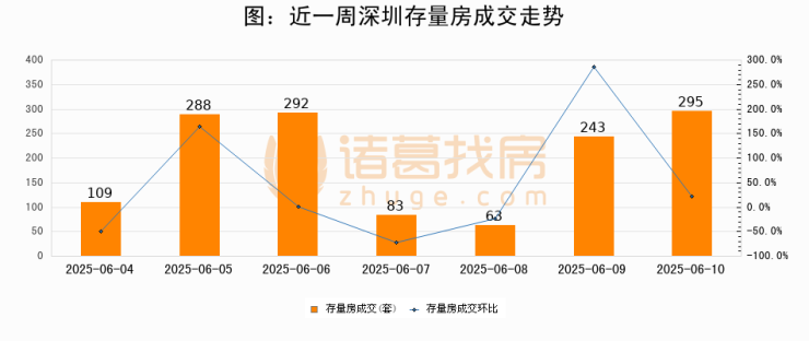 从存量房来看,2025年06月10日深圳存量房单日成交295套,比昨日增加52套,环比上涨21.4%。从近一周存量房成交来看,深圳存量房日均成交套数为196套,06月10日单日成交295套,高于近一周平均水平50.5%。