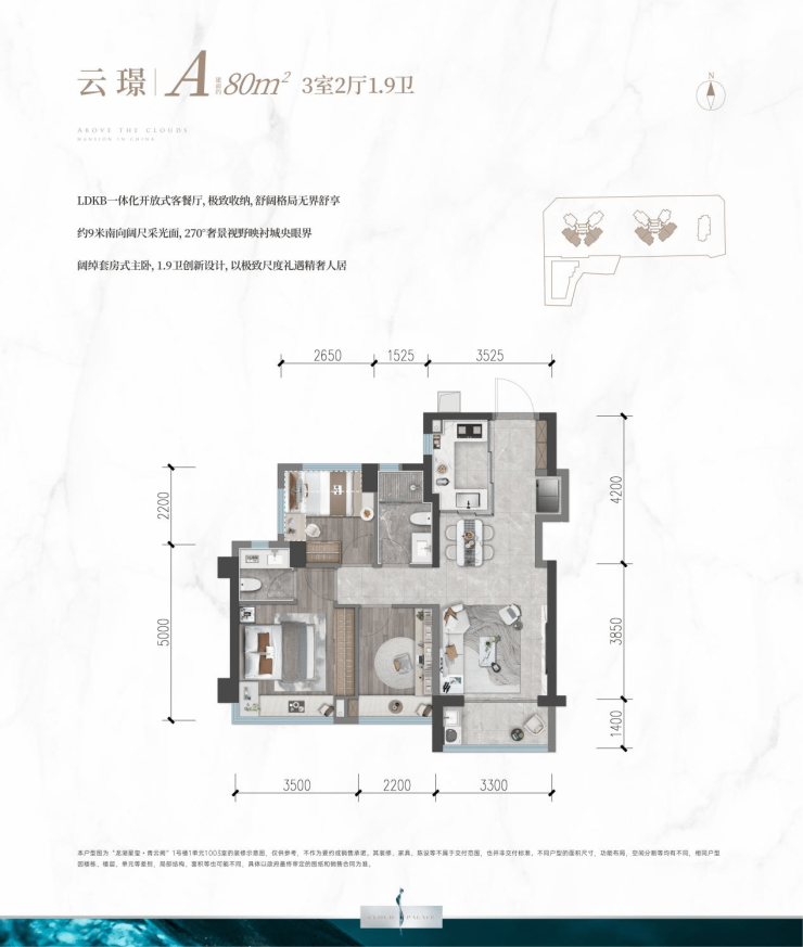 比如,建面约80㎡的样板间,拥有3房2厅1.9卫,是目前区域市场上唯一一个80㎡实现1.9卫的户型,并且该项目还有全系270度奢景视野;113㎡户型更是做到了环绕式三面飘窗设计,还拥有超14米舒阔南向五开间,收纳空间约为27.55立方米,相当于765个20寸的登机箱容积,而且还首创板块内窄边吊顶,实用性拉满。