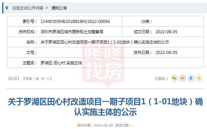 近日,罗湖区城市更新和土地整备局发布《关于罗湖区田心村改造项目一期子项目1(1-01地块)确认实施主体的公示》。