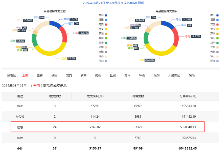 2024年5月21日新房住宅共网签24套。宝安9套;福田0套;龙岗4套;罗湖0套;南山3套;盐田0套;龙华3套;坪山4套;光明1套;大鹏0套;深汕0套。