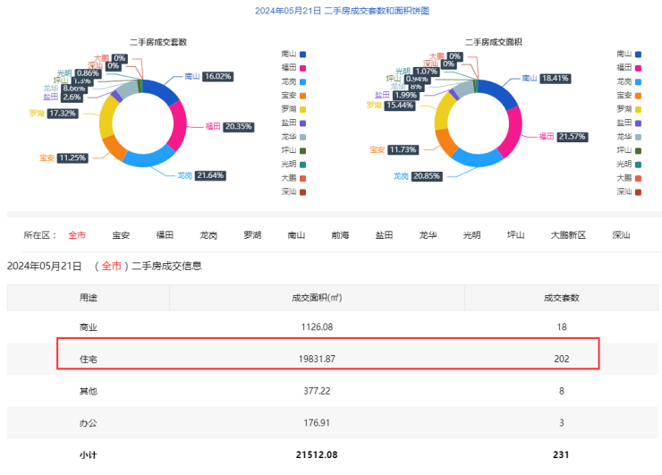 2024年5月21日二手房住宅网签202套。宝安24套;福田38套;龙岗45套;罗湖38套;南山32套;盐田4套;龙华17套;光明2套;坪山2套;大鹏0套。