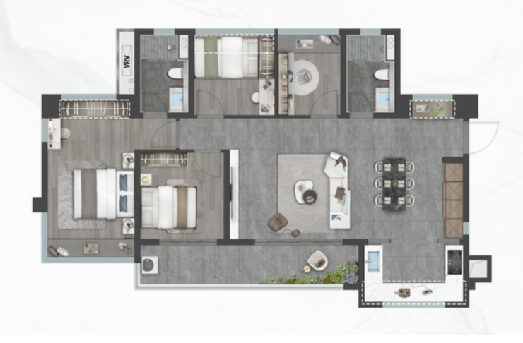 约13.7米连续开窗面,这个产品放在南山、福田绝对是千万起步。大主卧带270°观景大飘窗,预留衣帽间+书桌位置,更大自主空间。宽幕阳台设计,延伸客餐厅的视觉感和功能性。双通阳台,能很好从客厅视角隐藏家政晾晒区,处处都是隐藏的小心机,让居家更私密,更具尊崇的奢宅感。