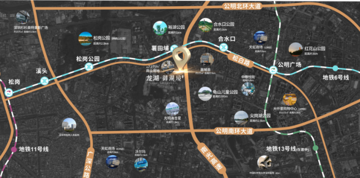 项目位于光明区利益统筹第一梯队的薯田埔口岸,距离地铁6号线薯田埔站仅约300米,6号线快速接驳13号线(在建)、11号线,瞬连核芯区域,近享南光高速、松白路双主轴纵横。