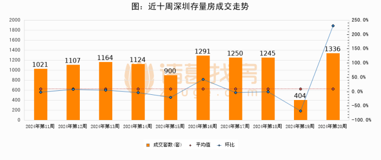 存量房方面,第19周深圳存量房成交1336套,较上周增加932套,环比上涨230.7%。从近十周成交走势来看,周均成交套数为1084套,本周高于平均水平23.2%。