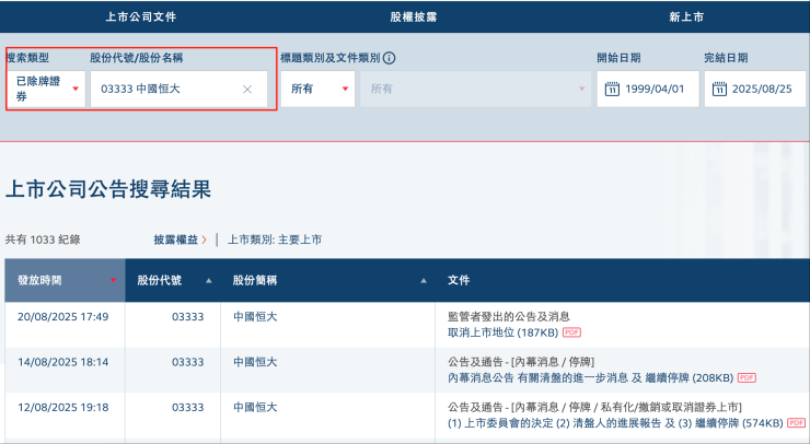 8月25日上午9时起,中国恒大的上市地位被正式取消。目前,在港交所披露易上搜索,中国恒大已正式被列入“已除牌证券”。中国恒大约16年的上市之路画上句点。