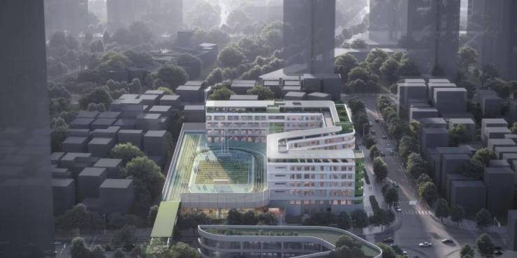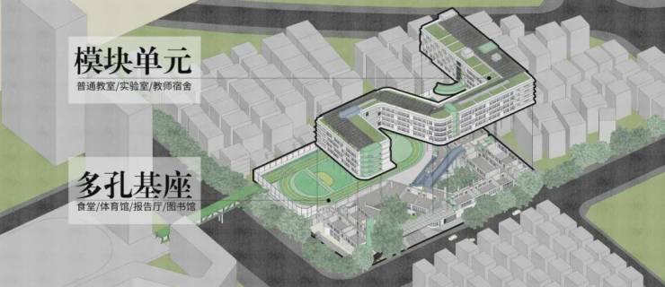 正山甲中学总建筑面积约4万㎡,设计采用多孔的基座+规则的塔楼,共同构成教学综合体。