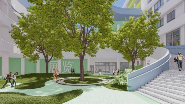 参天古树四季常绿,十年树木百年树人。三棵香樟树主导着整个教学庭院,枝叶散发香气、过滤空气。
