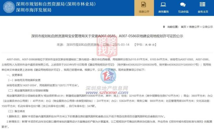 近日,深圳市规划和自然资源局宝安管理局公示A007-0585、A007-0586宗地建设用地规划许可证变更。
