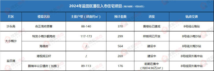 2024年,盐田预计有5盘入市,其中鹏瑞半山云璟府预计加推新品,其余4盘均是首次入市的楼盘。