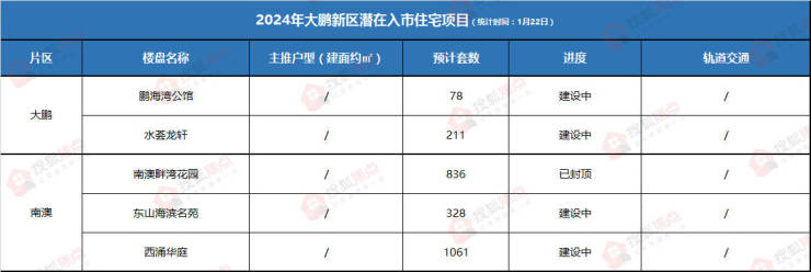 根据统计,大鹏2024年预计有5盘入市,但这5盘均已于动工,但前期公示的信息太少,因此只能作为一个参考。