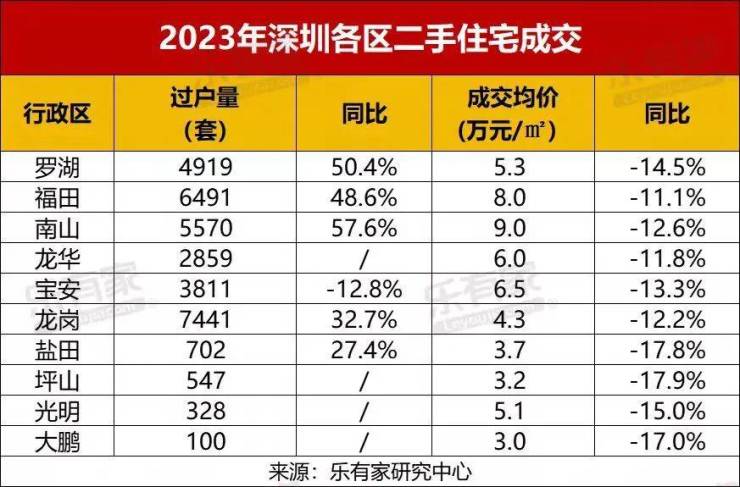 据乐有家数据显示,2023年,盐田二手住宅成交相比去年上涨了27.4%,而坪山及大鹏则同比持平。