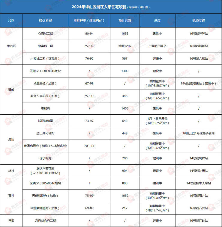 2024年坪山预计有16新盘加推或开盘,其中近3/4的房源来自于旧改项目,剩余1/4的房源则是招拍挂出让的限价新盘。