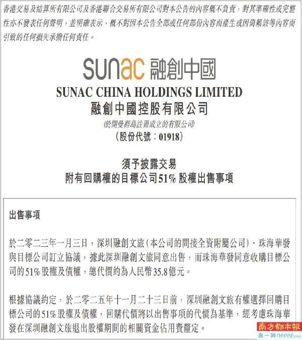 深圳冰雪文旅城迎来新进展。1月3日,融创中国控股有限公司发布公告,在附有回购权的前提下,将深圳融华置地投资有限公司51%的股权与债权转让给珠海华发,总金额约为35.8亿元。