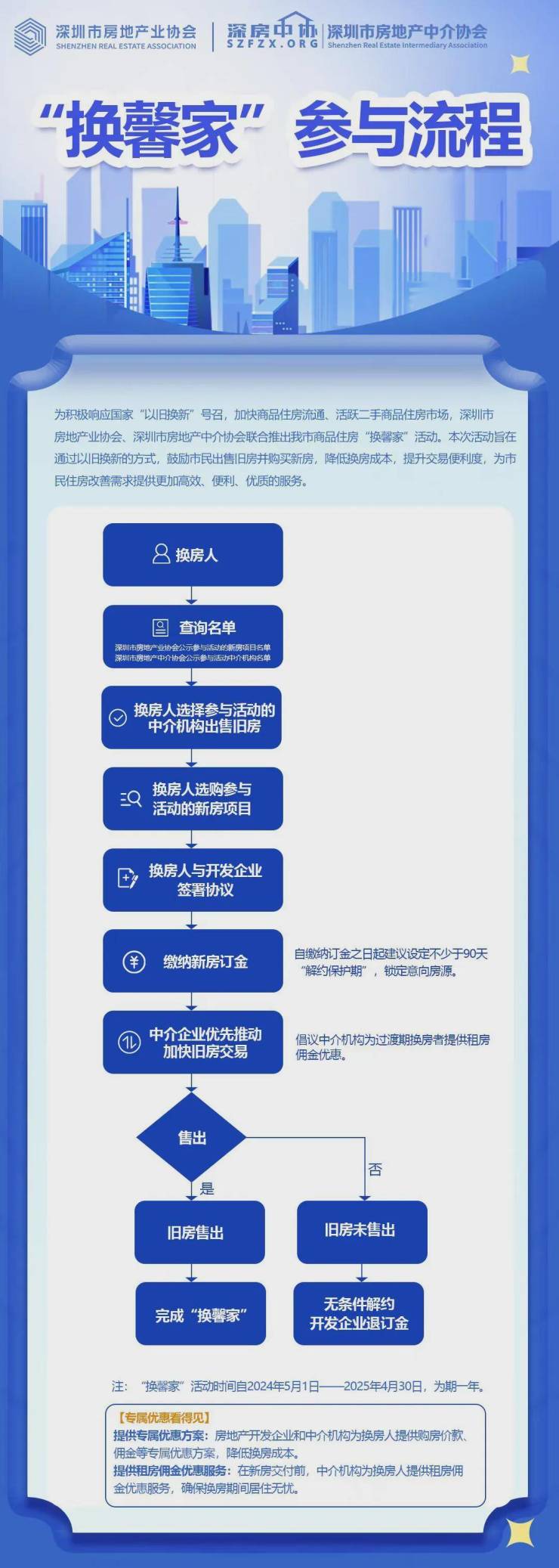 此次活动是由深圳市房地产业协会、深圳市房地产中介协会联合开展名为“换馨家”的商品住房“以旧换新”活动,目的主要是为加快深圳市商品住房流通,提升交易便利度,更好满足居民刚需和改善型住房需求。