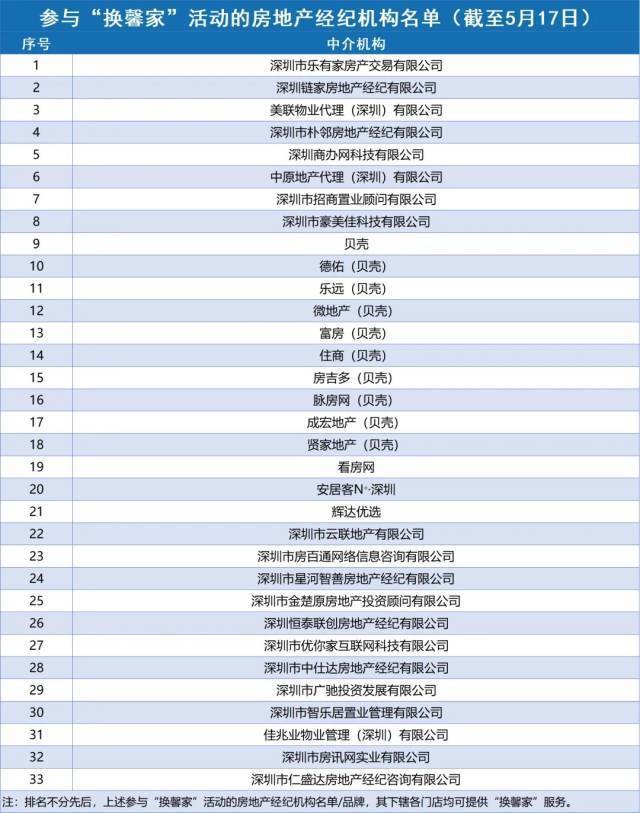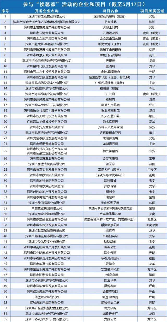 截至5月17日,深圳已有55家房地产开发企业和项目、33家房地产经纪机构参与购房“以旧换新”活动。