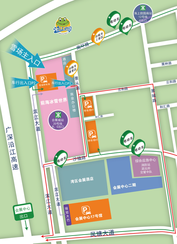机动车停车:前海冰雪世界停车场;景从路V1、V2停车场;湾区会展酒店停车场。