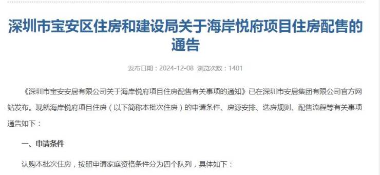 本批次住房按照申请家庭资格条件分为四个队列、分队列摇号排序选房。线上申请认购时间为2024年12月9日14:00至2024年12月15日18:00