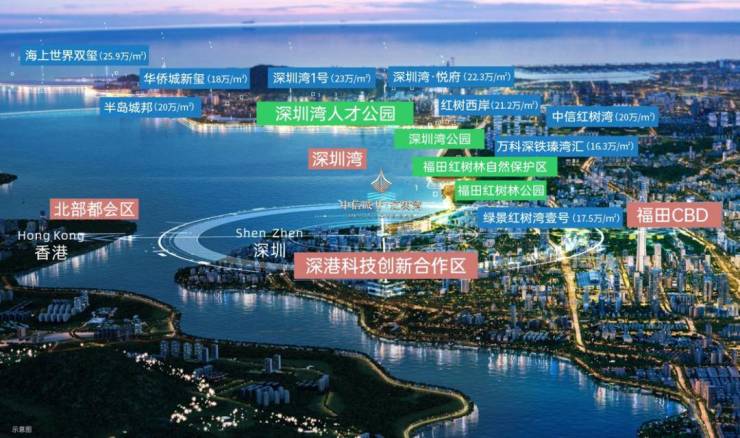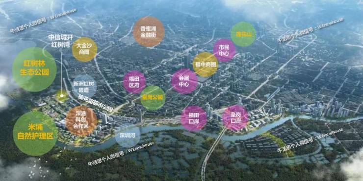 项目东翼向深港口岸经济带、环中心公园活力区延展;西翼面向深圳湾滨海总部走廊、大金沙-车公庙及香蜜湖金融街;而南面和规划中的香港北部都会区一河(深圳河)相隔.