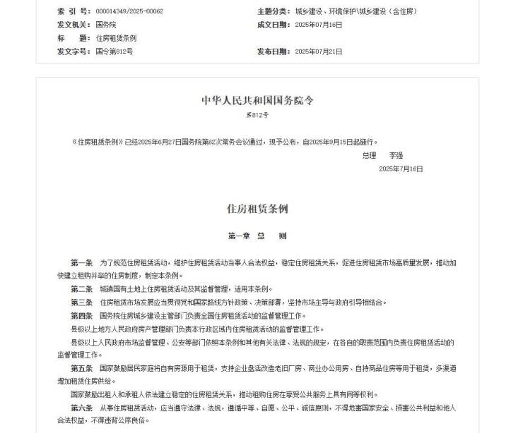 7月21日,《住房租赁条例》(以下简称《条例》)公布,涉及规范出租承租活动、规范住房租赁企业行为、规范经纪机构行为、强化监督管理、严格责任追究等内容。《条例》自2025年9月15日起施行。