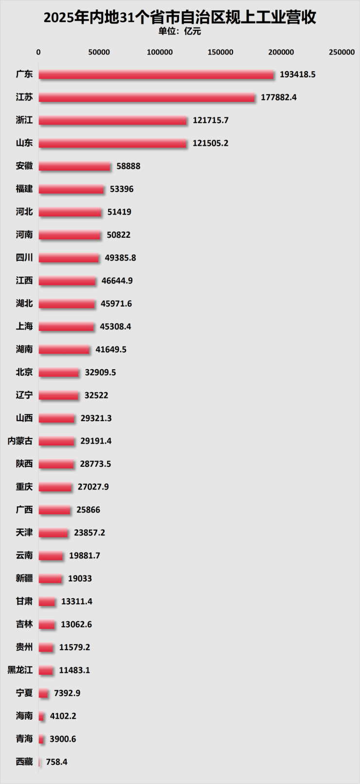 2025年广东省的规模以上工业营收高达19.34万亿元,稳稳位居全国第一。