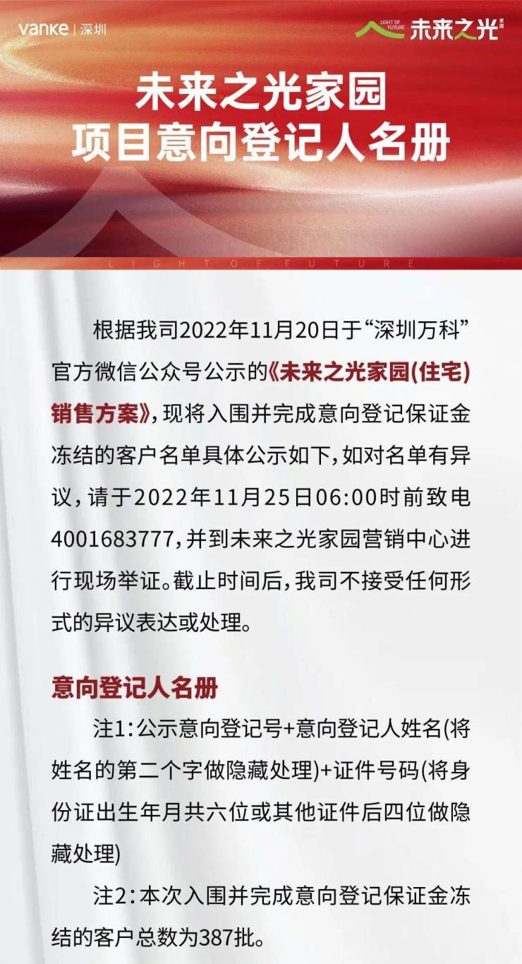 11月24日上午,万科未来之光家园意向登记人名册公示,本次共有387批客成功意向登记。11月25日进行选房顺序号摇号,11月27日进行正式选房。
