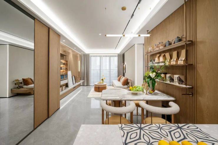 98㎡是餐客厅一体直通阳台的设计,样板间的厨房改造成了半开放式,双开门大冰箱则搬到了S墙位置,整体看起来又通透又整洁。