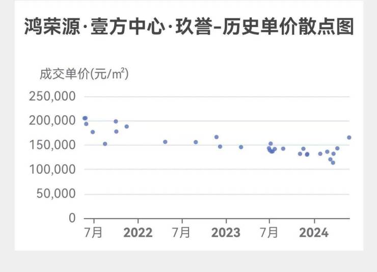 以壹方中心为例,前几年房价一直处于15万/㎡的水平线上,而2023年下半年开始跌破15万关口,2024年3月份左右成交价更是滑到了11万+/㎡。