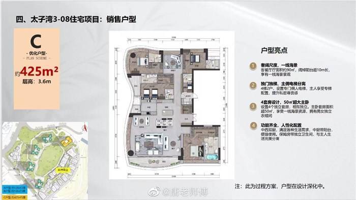4月17日,家在深圳网友爆料,南山蛇口招商太子湾项目户型图出炉,户型为建筑面积约126平2房、425平5房,总共608套住宅,价格约13.2万/平,带装修。