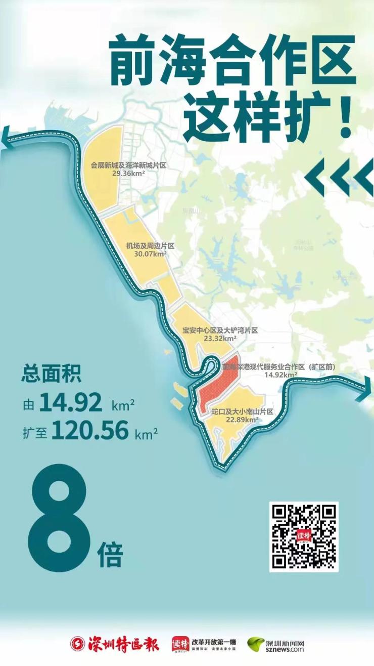 方案中明确提到,前海合作区总面积由14.92平方公里,扩展至120.56平方公里,面积足足扩大了8倍,具体范围包括: