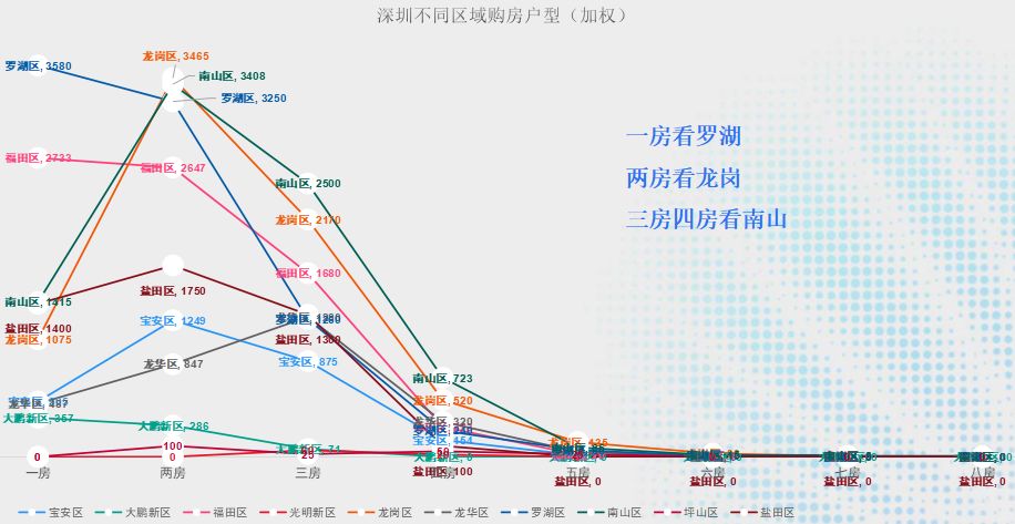 除了面积段,还可以根据实际需求进行片区选择,根据每个区域成交的户型套数、人口总数进行加权,可以反映区域热门户型,比如一房在罗湖最热门,两房龙岗南山和罗湖都是比较好的选择,从三房开始,南山和龙岗是比较受到欢迎的选择。