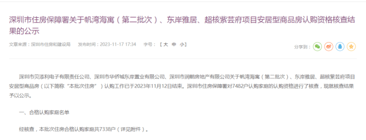 11月17日深圳住建局公示了帆湾海寓(第二批次)、东岸雅居、超核紫芸府项目安居型商品房认购资格核查结果,合格认购家庭共7338户,其中两房认购家庭共5811户,三房认购家庭共1527户。