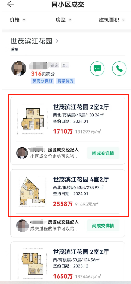 链家平台显示,世茂滨江花园2024年1月成交了两套,分别是130平方米、总价1710万元和279平方米、总价2558万元的高区住宅(45楼以上),单价区间在9.2万-13.1万元/平方米。