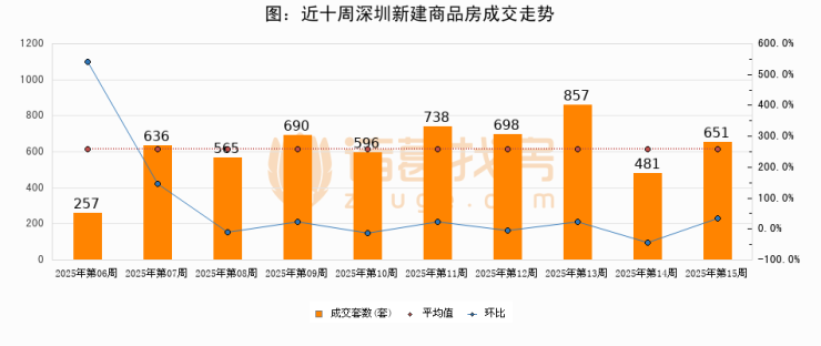 进入2025年第15周(04月07日-04月13日),深圳新建商品房成交651套,较上周增加170套,环比上涨35.3%。从近十周成交来看,周均成交套数为616套,本周成交651套,高于近十周平均成交量5.7%。