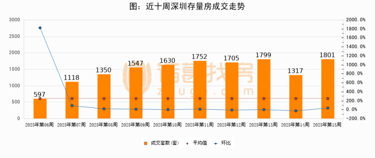 存量房方面,第15周深圳存量房成交1801套,较上周增加484套,环比上涨36.8%。从近十周成交走势来看,周均成交套数为1461套,本周高于平均水平23.3%。