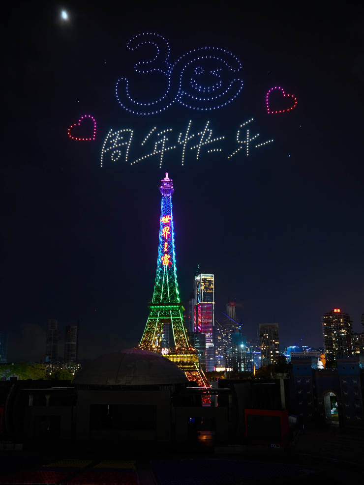 空中舞影映苍穹,火树银花耀鹏城。6月18日,深圳夜空首次呈现无人机和烟花的联合演出,近千架无人机和上万发烟花在深圳世界之窗埃菲尔铁塔和凯旋门上空腾空而起,化身为流光溢彩的唯美画卷,全程30分钟的精彩演出为游客和市民带来一场“声光电”完美交融的视听盛宴。此次演出是深圳世界之窗为庆祝开园30周年特别策划,感恩回报社会各界的厚爱。当天,景区第29届国际啤酒节、全新游乐项目侏罗纪水世界也盛大启幕,暑期将为游客带来集啤酒文化、精品演艺、潮流音乐、缤纷动感项目于一体的多元体验。