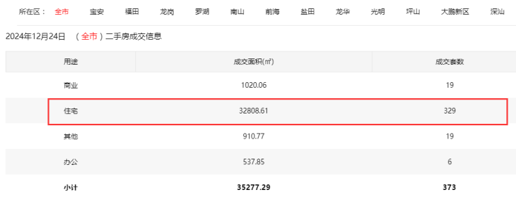 2024年12月24日二手房住宅网签329套。其中,宝安41套;福田62套;龙岗80套;罗湖37套;南山51套;盐田4套;龙华38套;坪山6套;光明8套;大鹏2套。