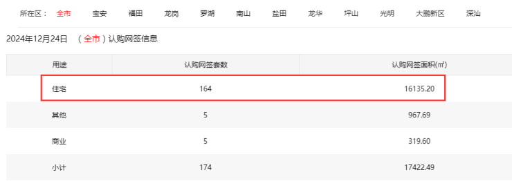 2024年12月24日新房住宅认购网签164套。其中,宝安12套;福田3套;龙岗35套;罗湖5套;南山13套;盐田0套;龙华67套;坪山3套;光明25套;大鹏1套;深汕0套。