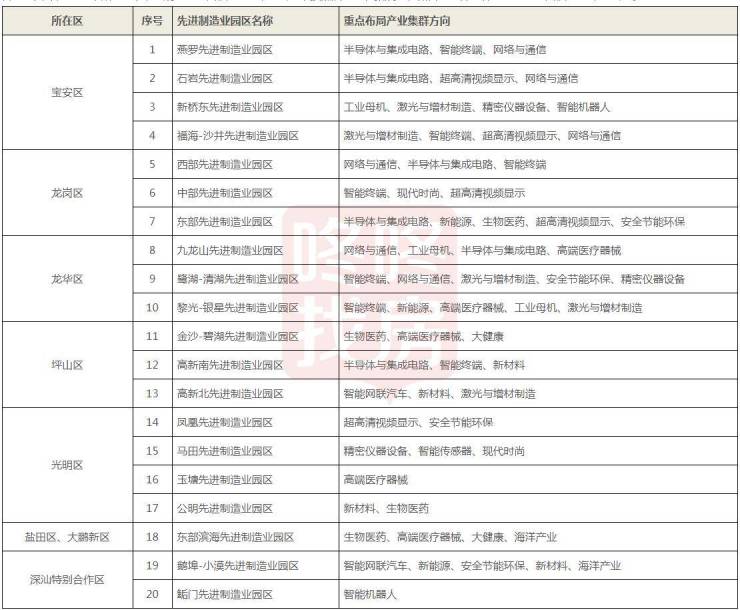 为了以高质量产业空间保障先进制造业发展,深圳市工业和信息化局、深圳市规划和自然资源局同步印发了《深圳市20大先进制造业园区空间布局规划》,在宝安、龙岗、龙华、坪山、光明、盐田、大鹏新区、深汕特别合作区规划布局了总面积约300平方公里的20个先进制造业园区,并明确了各园区产业发展主导方向,为促进战略性新兴产业集群化发展提供了空间基础。