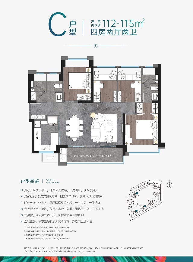建面约112-115㎡四房两厅两卫,在设计上可谓是可圈可点。万科充分考虑到人生不同阶段的不同需求,从居住的实用性、功能性和舒适性出发,不仅做到了轩阔四房布局,更是做到了大横厅、大阳台及三开间朝南设计,以超大采光面,锻造三代同堂的格调生活。LDK一体化厨房,采光通风全景通透,中西分厨,在家和朋友开趴、打游戏、享受烹饪或者和家人一起互动,满足多种空间使用需求。