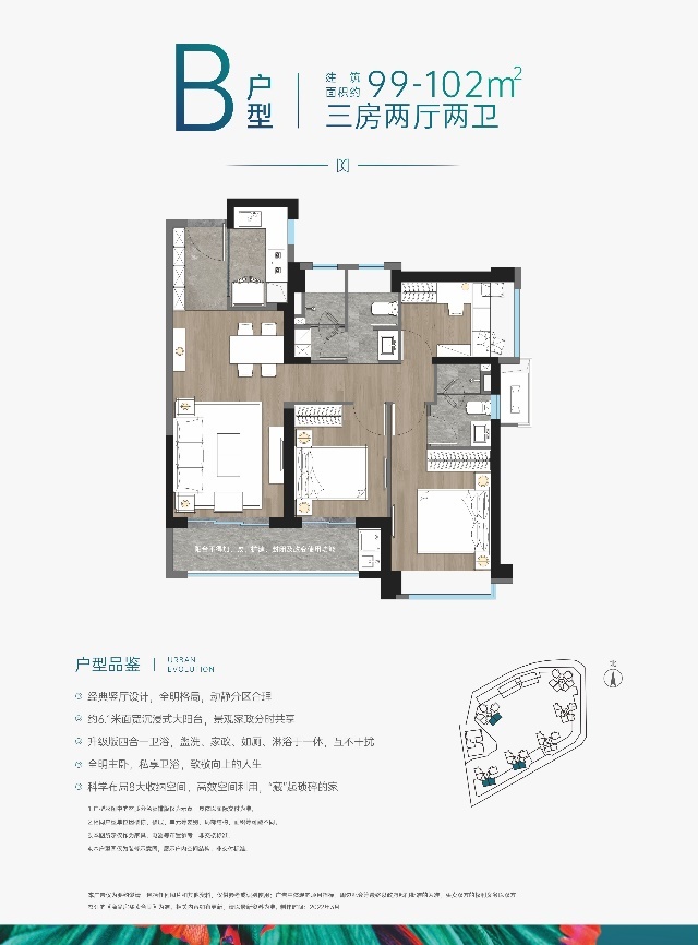 建面约99-102㎡三房两厅两卫,更加注重户型的人性化、精细化设计,整个户型方正通透,约6.1米面宽沉浸式阳台,引阳光清风入室,锻造全明空间;科学居家动线,合理利用每寸空间,减少过道、拐角,超高使用率;升级版四合一卫浴,以及全屋8大收纳系统。