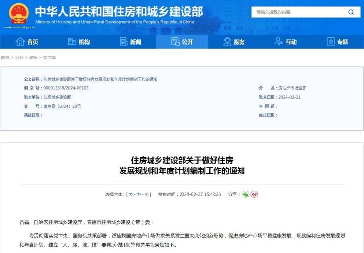 2月27日,住房城乡建设部公布《关于做好住房发展规划和年度计划编制工作的通知》。《通知》指出,住房发展规划和年度计划是建立“人、房、地、钱”要素联动机制的重要抓手。各地要充分认识做好住房发展规划和年度计划的编制实施工作的重要性,科学编制规划,认真组织实施,根据人口变化确定住房需求,根据住房需求科学安排土地供应、引导配置金融资源,实现以人定房,以房定地、以房定钱,促进房地产市场供需平衡、结构合理,防止市场大起大落。