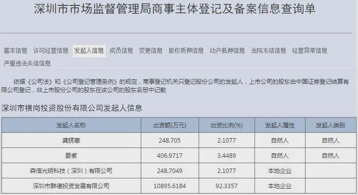 项目申报主体为深圳市横岗投资股份有限公司,查询工商信息显示,该公司大股东为深圳市群德投资发展有限公司,占股约92%,为信义集团关联公司。