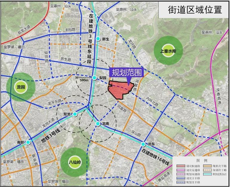 项目位于园山街道保安社区,城市主干道龙岗大道与城市次干道广达路交汇处西北侧,拟更新方向为居住、商业等功能。