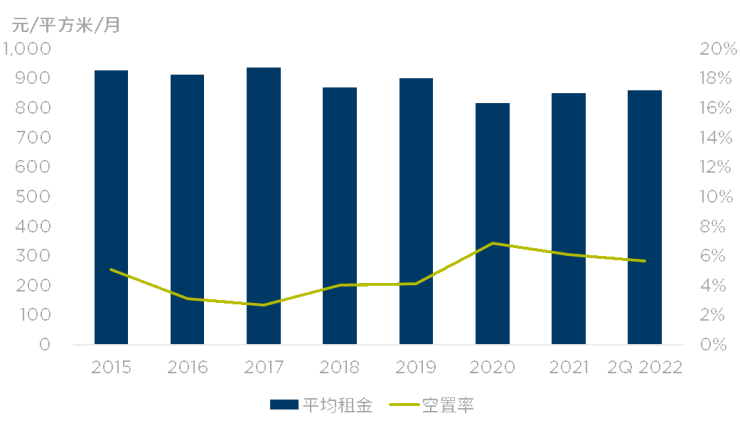 需求端来看,受到年初至今国内多个主要城市出现疫情及大规模管控,经济大盘承压和国际环境等多重因素影响,企业普遍趋于谨慎和理性,注重降本增效、精细化管理而不是粗放式扩张。近期的租赁实例中,除了延长免租期、装修补贴等常见优惠之外,出现部分企业在合同中加入保留扩租权的条款,在以较低的成本满足当前办公需求的同时,保留中短期便利扩租的权利。可见业主的租赁策略变得更加灵活,而对未来扩张抱有一定信心的企业在实际操作中也更为谨慎。在多重压力之下上半年全市甲级写字楼市场依然保持韧性,维持了相对平稳的走势,年中平均租金录得每月每平方米209.1元,较上年末下降0.7%;空置率则上升3.2个百分点至22.4%。