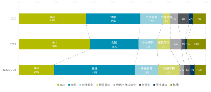 结合上半年全市的租赁成交来看,全市金融业租赁成交面积占比高达43.2%,国资控股企业依然在其中占主导地位,同时券商表现活跃。而TMT行业则由于进入深度调整期,租赁需求出现明显放缓,上半年TMT行业成交面积占比仅为18.9%,较去年同期下降约18个百分点,平均租赁成交面积亦下降了44.8%。在TMT各细分领域中,半导体行业逆势维持了较高的活跃度。