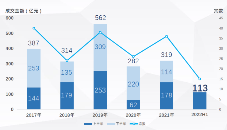 2022年上半年累计成交金额约113亿元,同比下降近37%;同时,成交宗数15宗与去年上半年18宗相仿,显示今年的平均成交规模进一步缩水,10亿以内成交额的交易为市场上的主流,占上半年总成交近九成。整体而言,上半年大宗交易市场延续了去年下半年以来的市场氛围,收到全球经济不确定性持续以及上半年多地疫情反复的影响,投资者更加趋于谨慎保守。