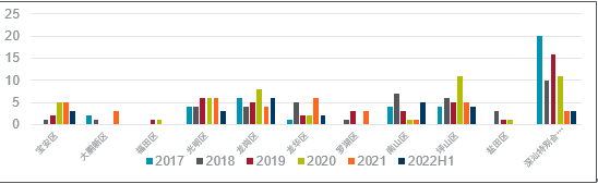 深圳每年工业用地出让数量约40宗,可新增产业用房面积450-550万平方米,主要集中在深汕、光明区、龙岗区、坪山区。2022年上半年深圳市工业用地出让26宗,可新增产业用房面积约260万平方米,相比过去5年同期平均水平,土地出让数量增长95%,建筑规模增长154%。